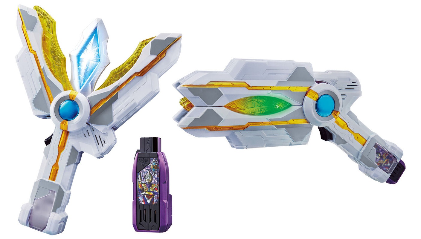 This item represents the transformation device/weapon that is used by our new main hero to transform in Ultraman Trigger and has two modes; the Hyper Gun and the Sparklence. Inserting the DX Hyper GUTS Key while in gun mode activates different attack sounds.